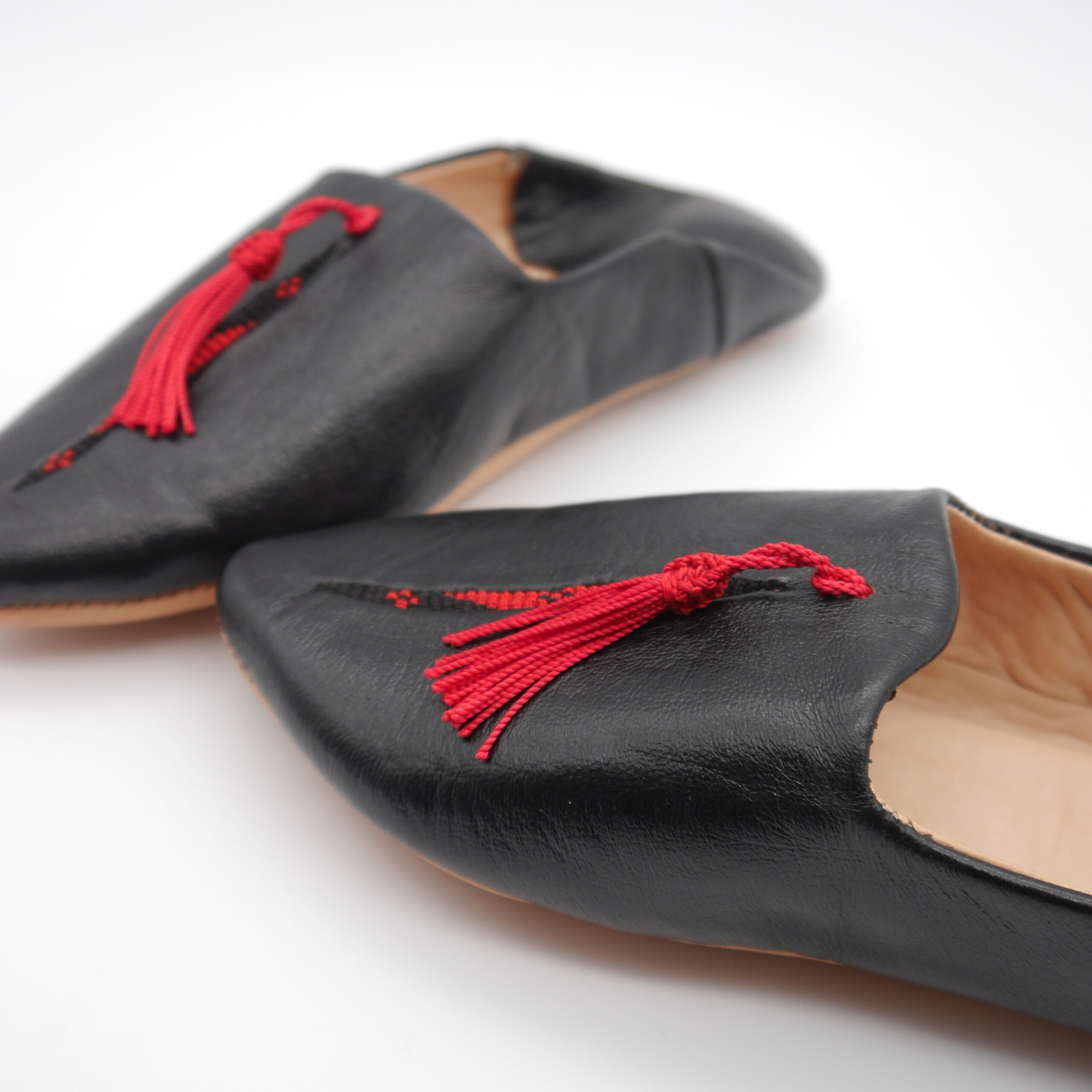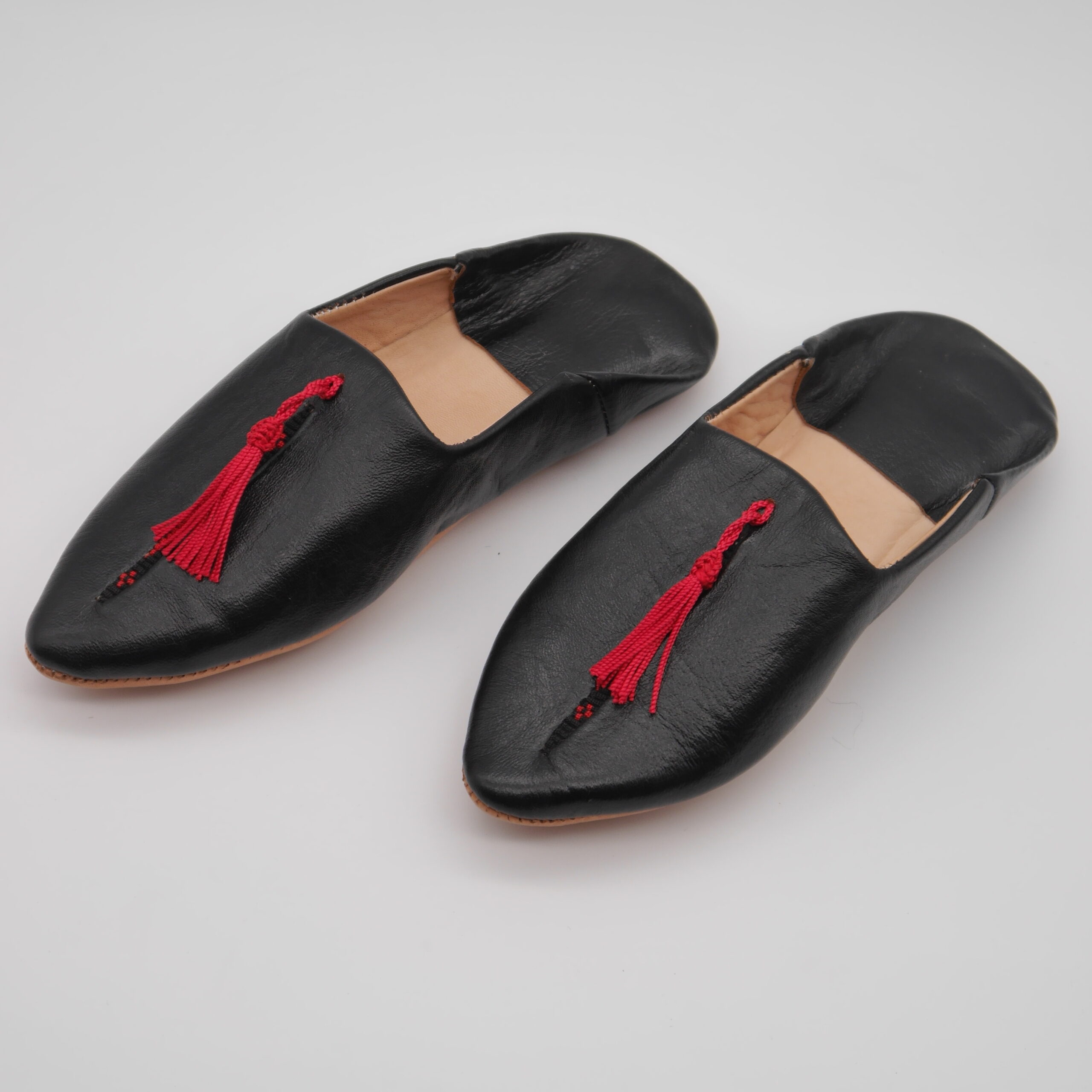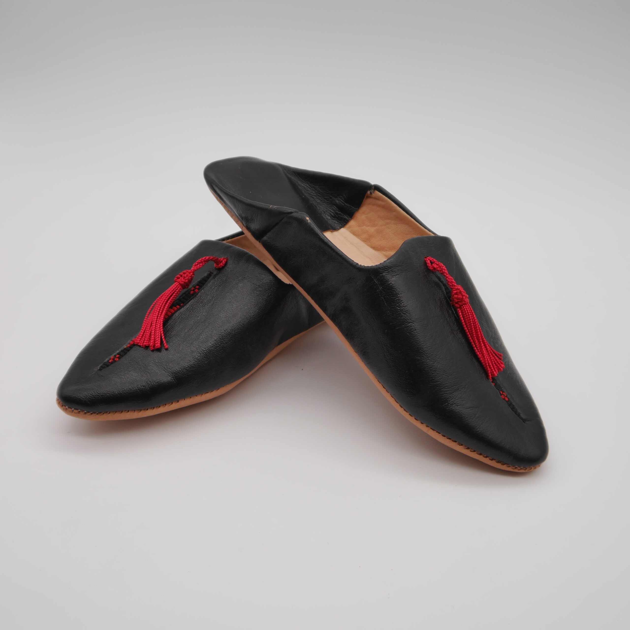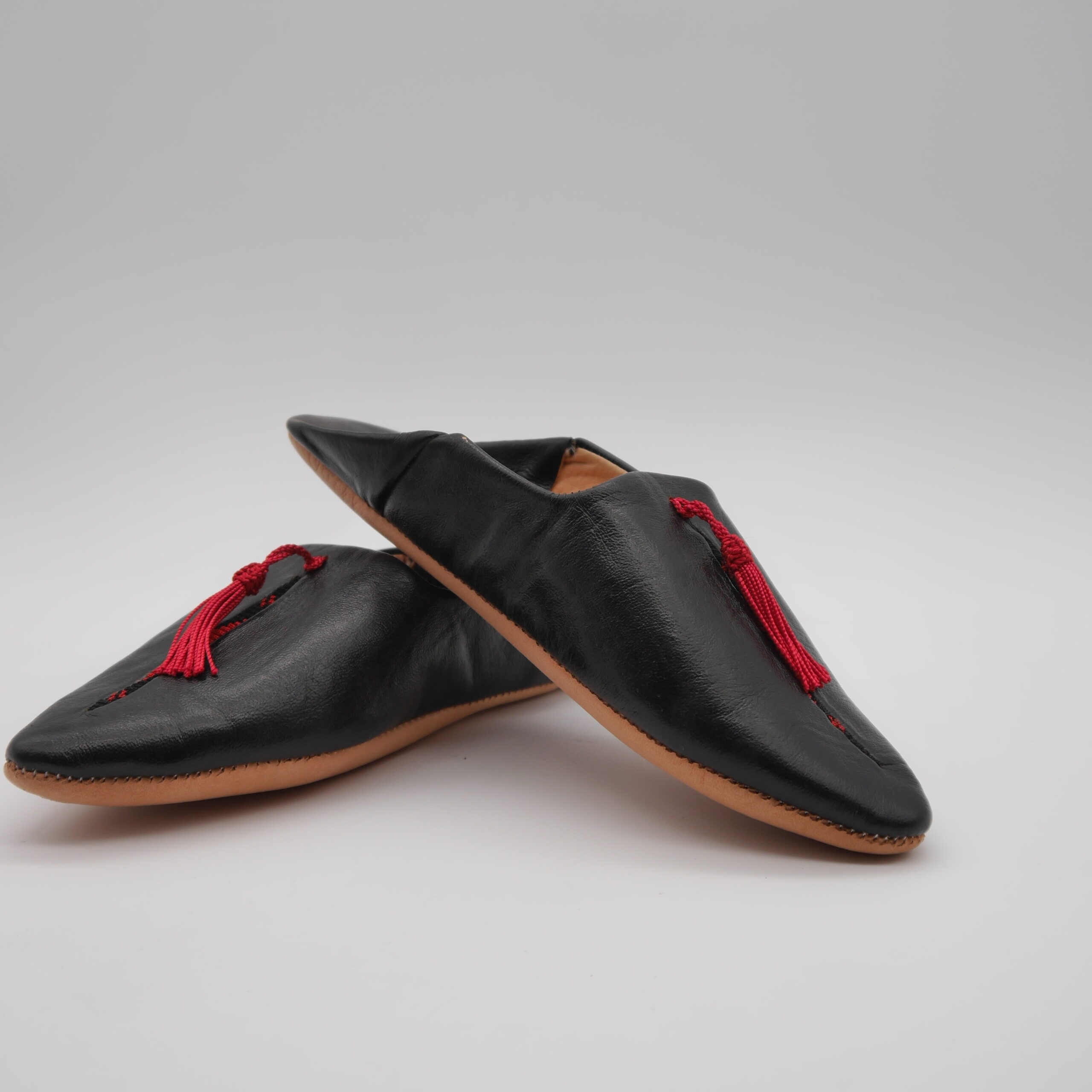 Step into tradition and comfort with these authentic Moroccan babouches, handcrafted in Marrakech from 100% genuine leather. Featuring a sleek black finish and elegant red tassel detail, these slippers blend cultural heritage with modern style. Ideal for indoor lounging or as a unique gift.